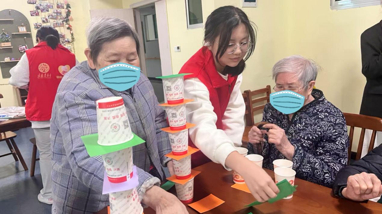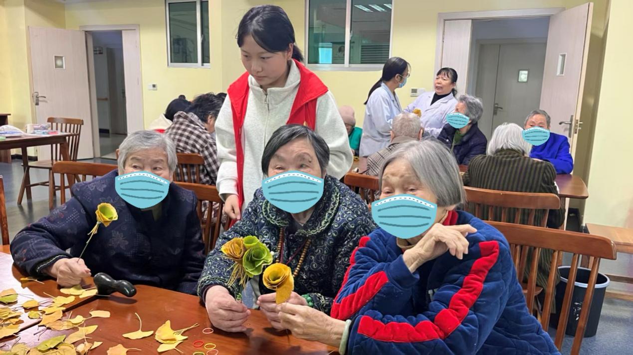 活动中,志愿者贴心陪伴长辈参与“纸杯叠叠乐”,耐心协助稳定杯塔、示范技巧;在“银杏叶变花”环节,手把手指导长辈卷叶制作,夸赞其作品精致;随后共唱《我只在乎你》,轻声引路、逐句提词,动情时挽手共舞。活动落幕,志愿者搀扶长辈离场、收好手作银杏花。