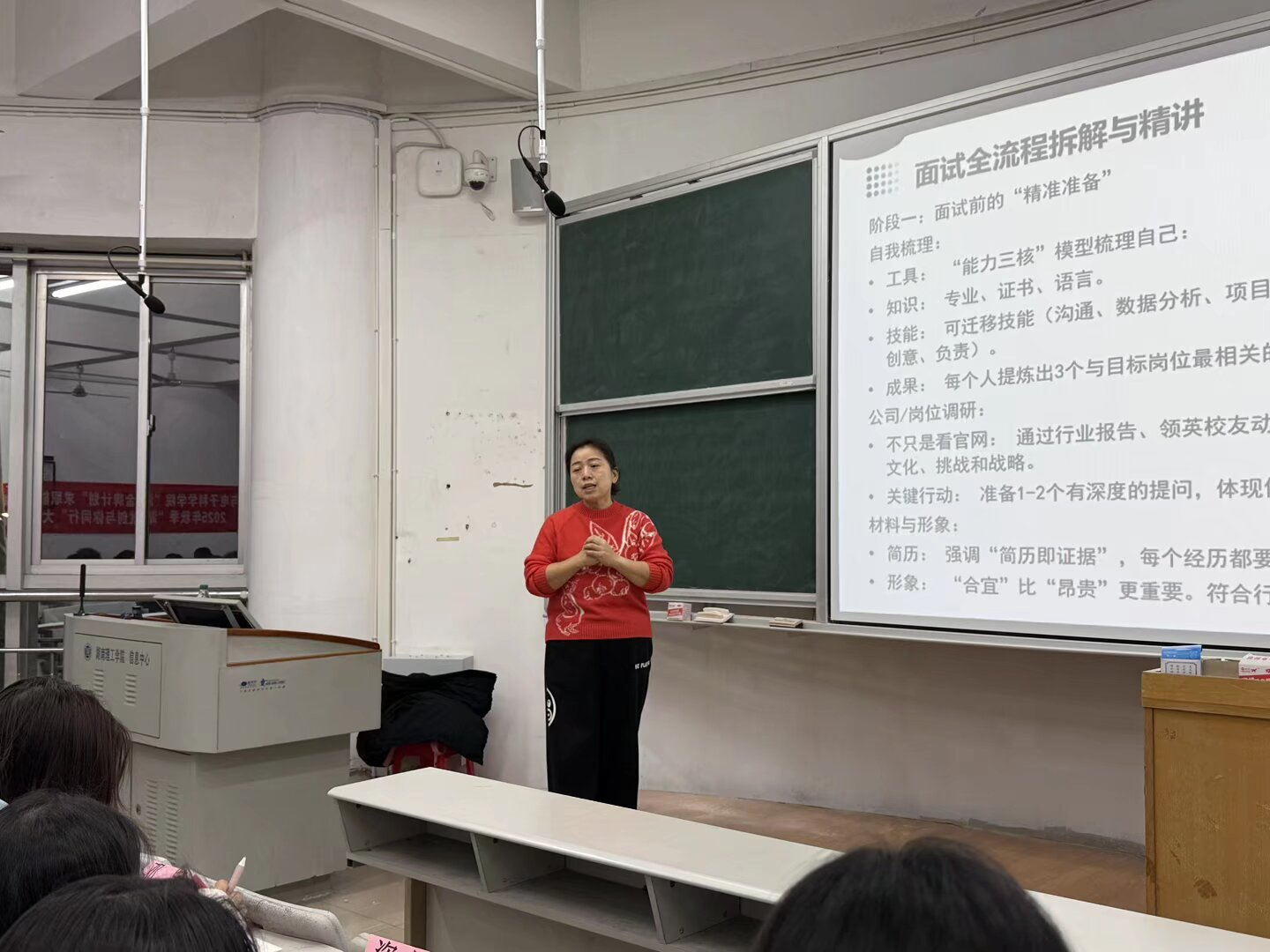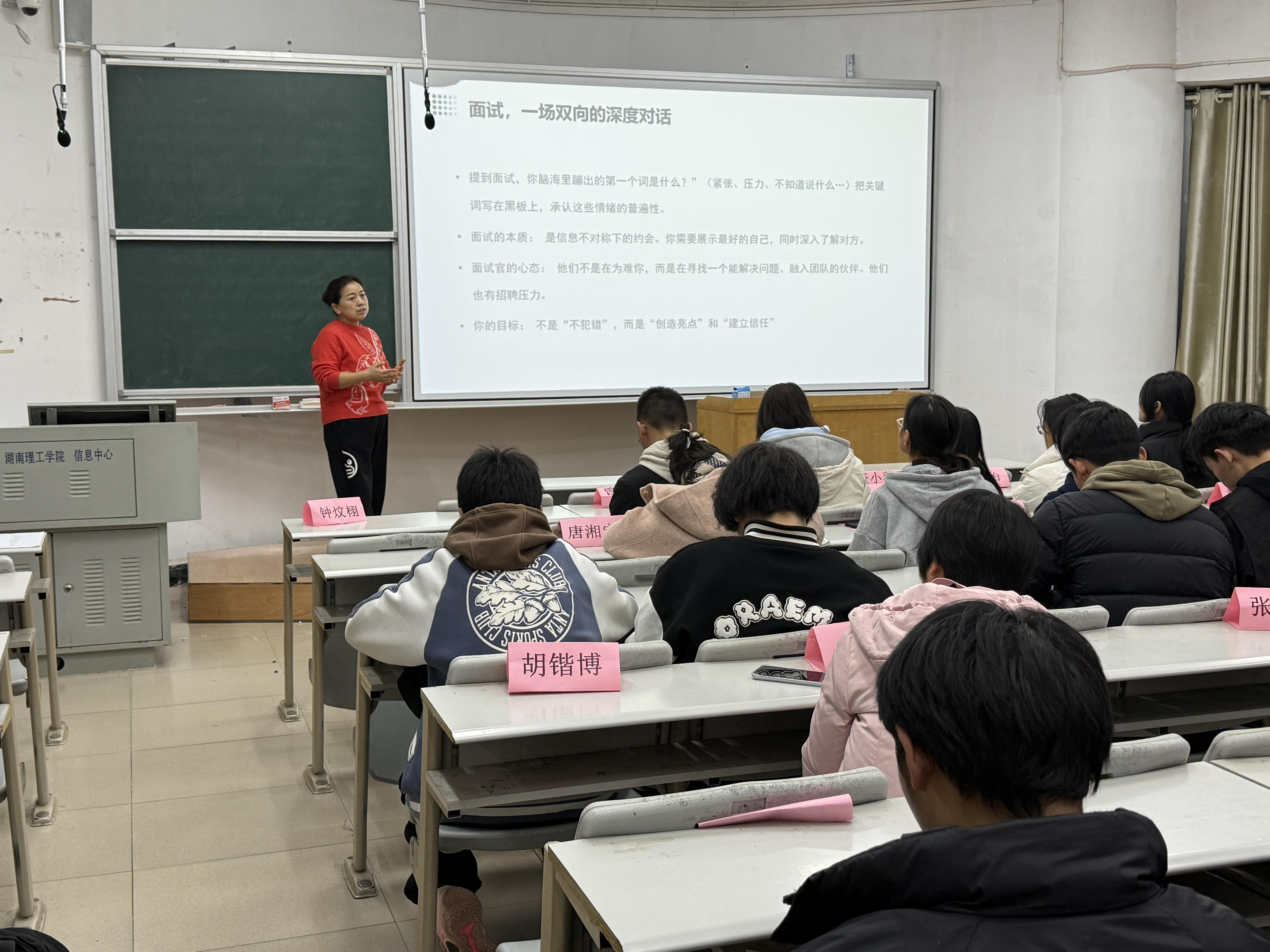 本次主讲人为国家一级人力资源管理师、拥有20余年实战经验的谭月老师。谭月针对职场实战经验,围绕简历制作核心,拆解结构优化、信息提炼、岗位匹配、避坑要点等实用技巧;她结合典型案例,指出简历同质化、重点不突出等常见问题,并给出针对性优化建议,内容专业且贴合需求,有效解答了同学们在求职材料准备中的困惑。