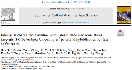 近期,公司光电材料与器件团队刘国博士联合兰州大学张振兴教授在材料科学领域学术期刊《Journal of Colloid and Interface Science》(中科院一区TOP,IF=9.7)发表题为“Interfacial charge redistribution modulates surface electronic states through Ti-O-Fe bridges: Unlocking dz2-pz orbital hybridization for fast sulfur redox”的研究论文,论文基本信息如图1所示。